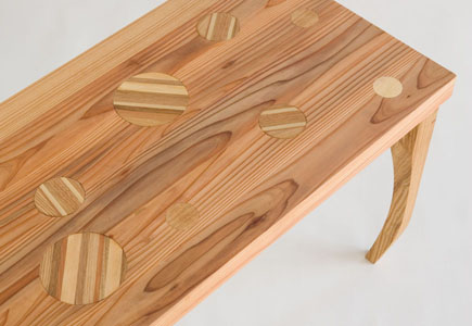 この間伐材とカラフルな樹種を組み合わせたベンチです。
